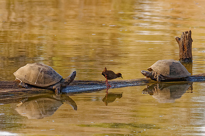 Die Wasserschildkröten halten einen Dialog mit dem Jacana-Küken.