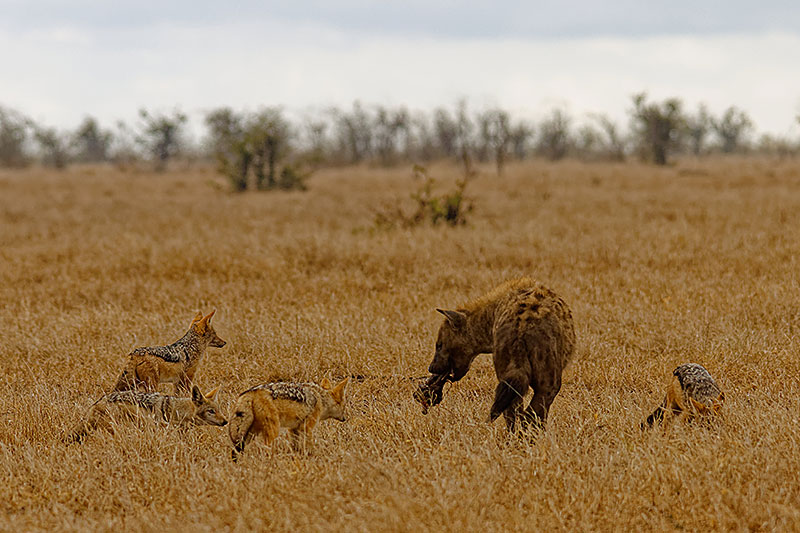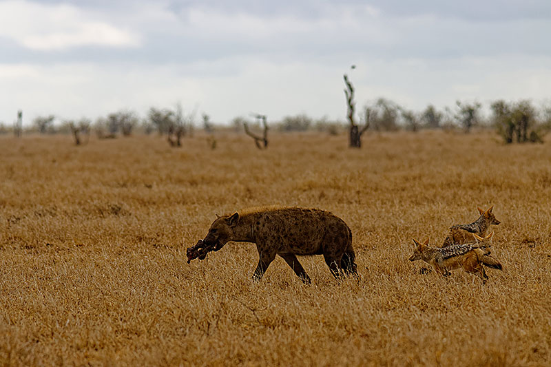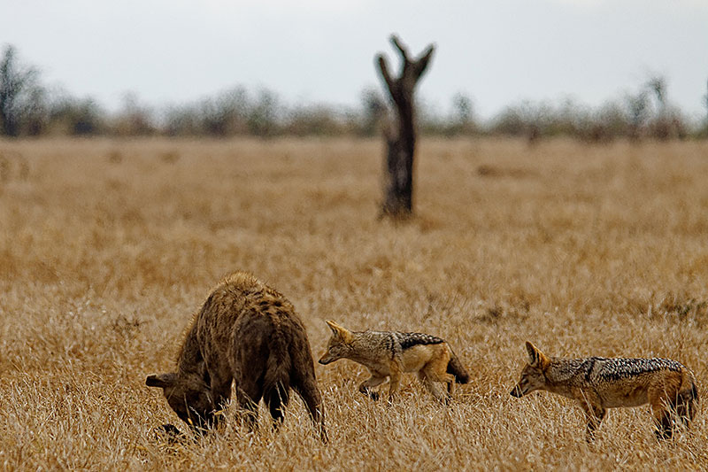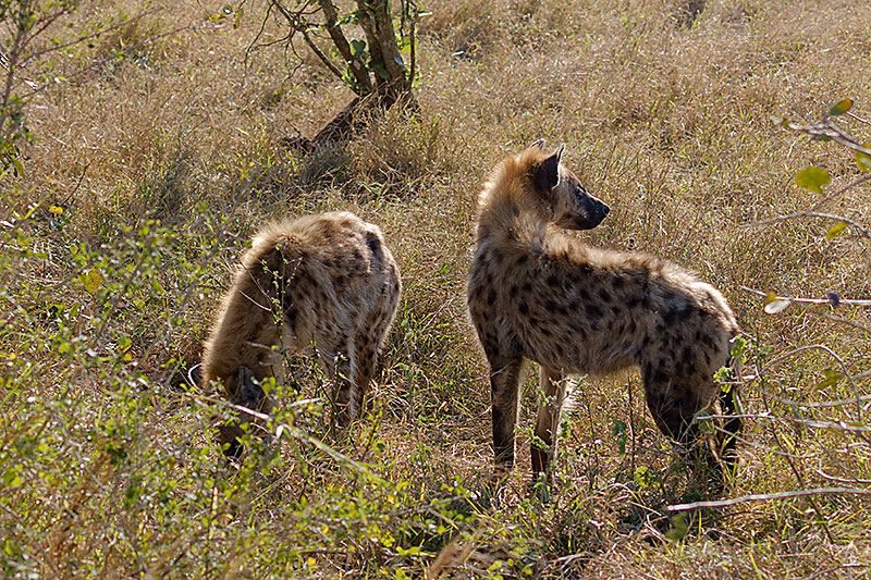 erkennen, aber uns fallen die Hyänen auf, die unter dem Baum herumlungern.