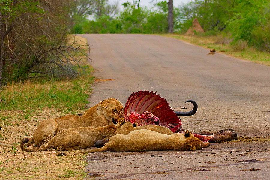 der Natur. Ein Löwenrudel hat am Vorabend mitten auf der Straße einen Büffel