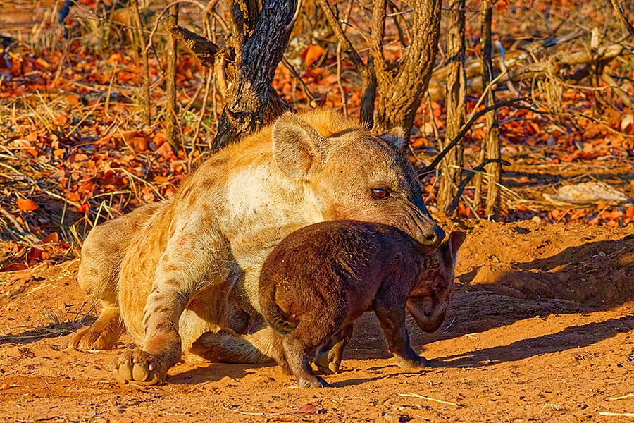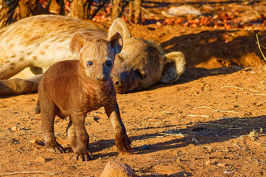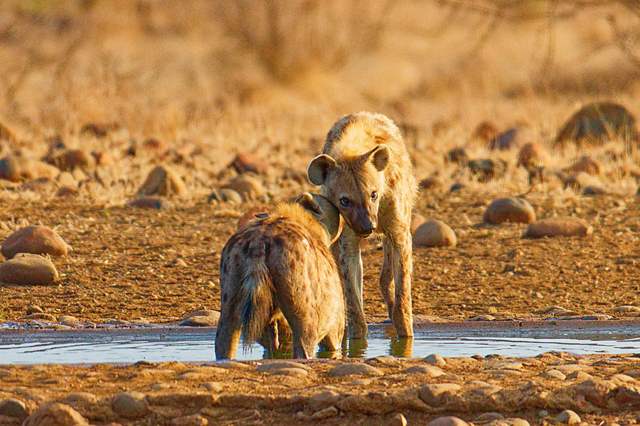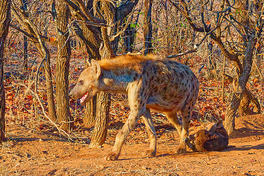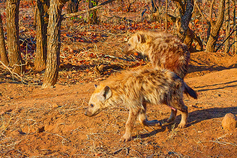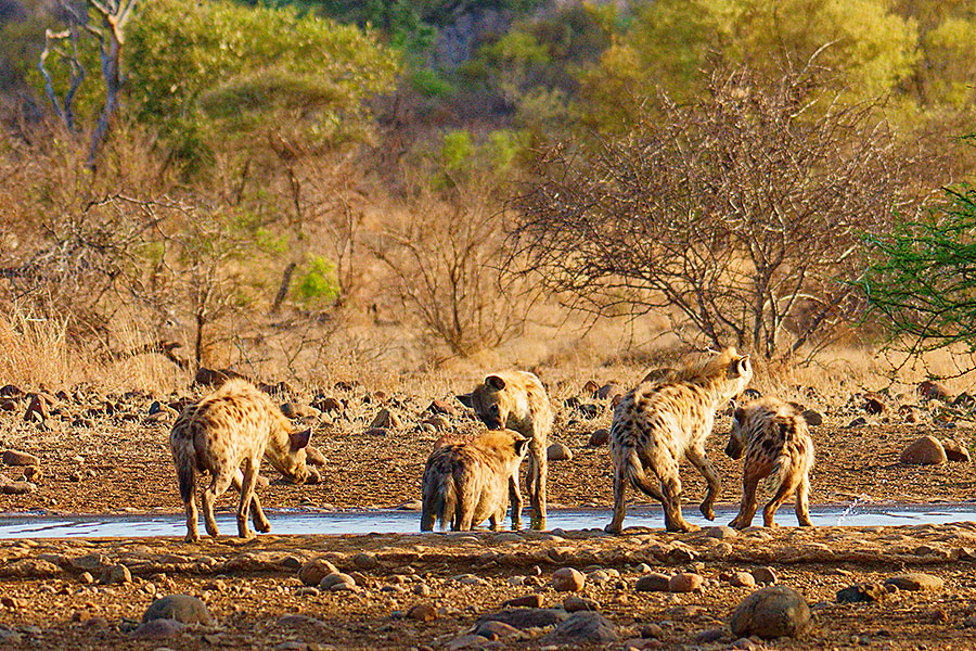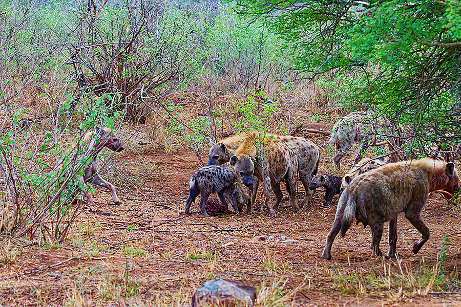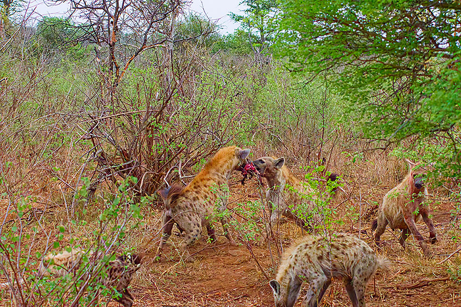Wir schauen nach und entdecken ein Hyänenrudel, welches wild umeinander rennt