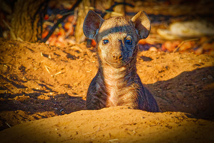 einem Gebüsch schauen uns die neugierigen Augen eines Hyänenbabys an.