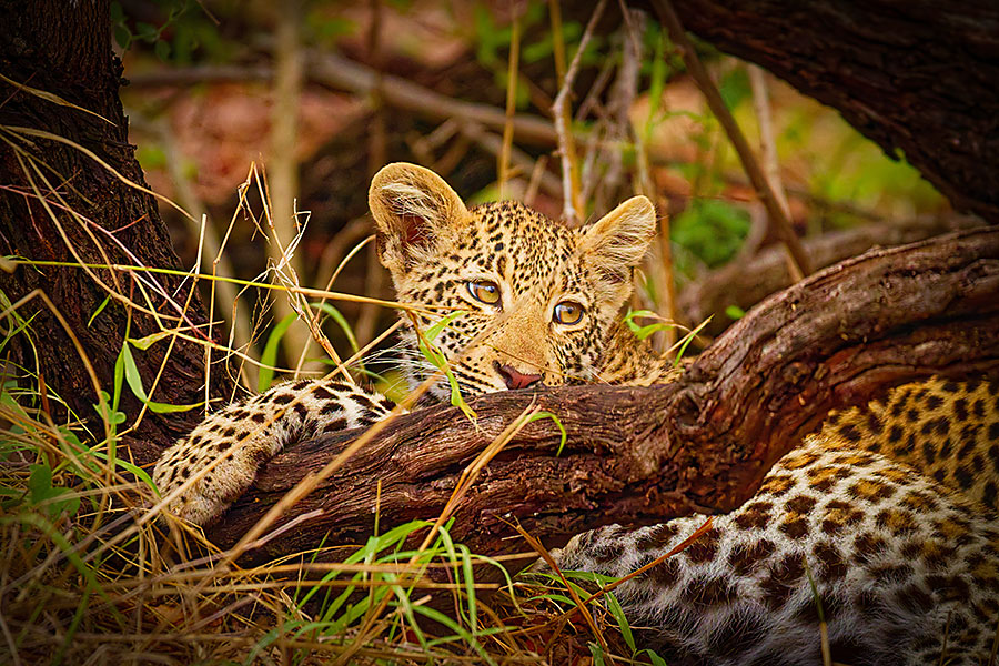 ruht die Mutter sich aus, während der kleine Leopard neugierig den Trubel um