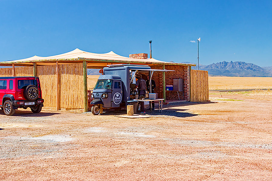 abgemähten Getreidefeldern ein mobiles Café zu errichten, bestehend aus einem
