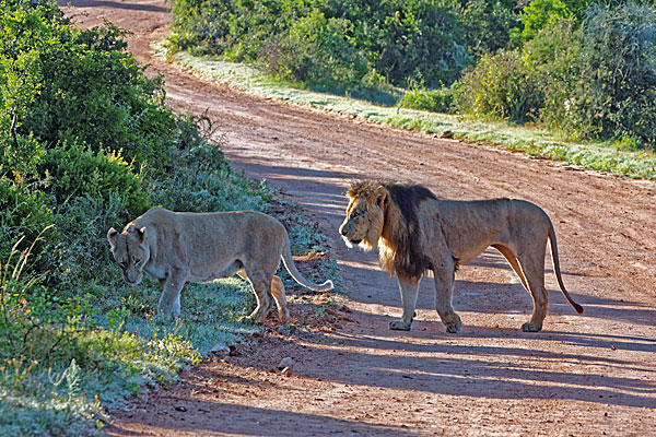 einen schönen Gruß vom sommerlichen Südafrika. Wir hoffen, es geht euch allen gut und ihr seid gesund und munter. Uns geht es jedenfalls gut und wir genießen das Land immer noch sehr. Wir freuen uns auch immer, wenn wir es unseren Besuchern zeigen können. Das war kürzlich wieder der Fall, denn Marion und Gerhard waren wieder zu Besuch, diesmal zum siebten Mal. Es muss also was dran sein an diesem Land. Ihr Wunsch war es, nochmal die berühmte Gardenroute zu fahren. Also haben wir uns aufgemacht und sind zunächst durch die Halbwüste Kleine Karoo zum Addo Elephant Nationalpark gefahren, wo wir vier Tage verbrachten. Wir waren gemeinsam hier schon zum dritten Mal, aber es ist ja immer wieder anders. Wenn man viel Glück hat, kann man frühmorgens sogar Löwen an der Straße sehen.