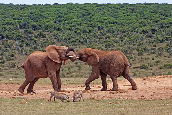 Im Park leben über 600 Elefanten, trotzdem haben wir am ersten Tag keinen einzigen gesehen, es ist wirklich erstaunlich, wie so große Tiere einfach im Busch verschwinden können. Man muss eben etwas Geduld haben. Aber dann haben wir doch noch große Herden gesehen und es ist immer wieder schön, das Treiben an einem Wasserloch zu beobachten. Da spielen halbwüchsige Elefanten miteinander