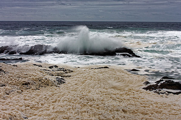 Nun ging es weiter zur Gardenroute, das ist ein 200km langes Stück der Nationalstraße 2, welche immer dicht an der Küste vorbeiführt. Unsere erste Station war die Tsitsikamma Sektion des Garden Route Nationalparks, einer wildromantischen Küstenlandschaft. Leider wurden wir mit schlechtem Wetter empfangen, was hier aber nicht ungewöhnlich ist, denn es gibt sogar Regenwald. Es war dunkel und das Meer total aufgewühlt.