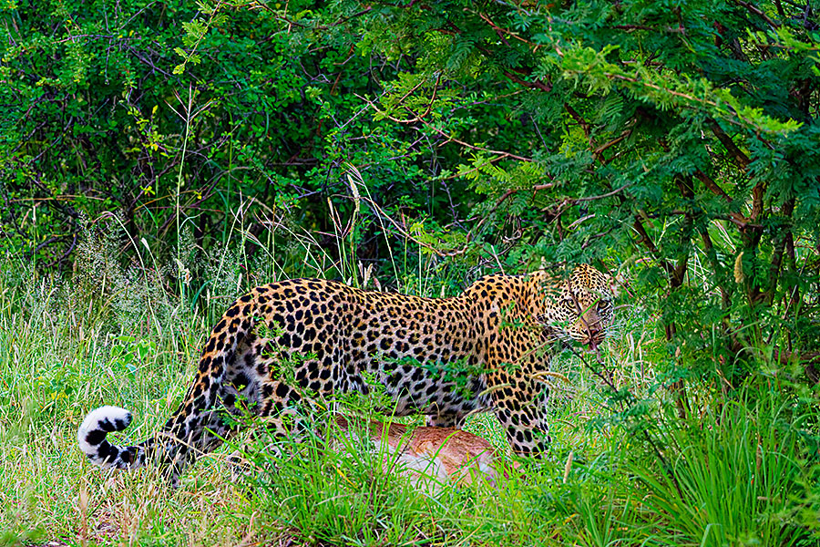 eine tote Impala, welches der Leopard hier gesichert hat. Vom Leoparden